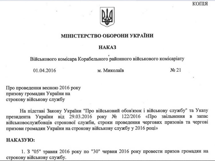 Згідно Закону України «Про військовий обов’язок і військову службу»: