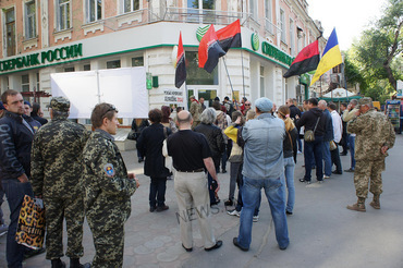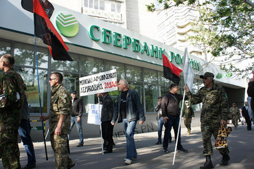 Митингующие в ходе акции направились к двум офисам «Сбербанка России» на проспекте Центральном, а также на перекрестке улиц Соборная и Потемкинская. Помещения банков были обклеены листовками с антироссийским содержанием, а также через охрану сотрудникам банка было передано письменное обращение с требованием немедленного снятия табличек со словом «Россия».