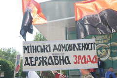 Участники акции держали в руках плакаты с надписями: «Мінські домовленості – державна зрада», «Корупція під час війни – мародерство», «Вимога нації – ні капітуляції», «Не купуй товари окупантів!», «Ми проти розкрадання держмайна», а также флаги Украины и «Правого сектора».