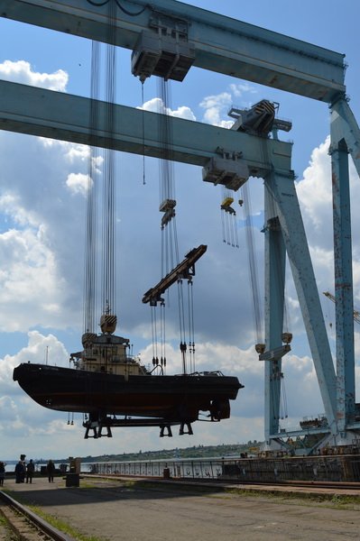 900-тонные краны «KONE», что работают на территории ЧСЗ, во время экскурсии, на глазах двухсот юных посетителей завода (учащиеся гимназии №3, Политехнического колледжа, профессионального судостроительного лицея) подняли буксир из воды и переместили его киль-блоки на околостапельной плите.