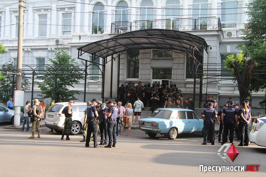 На форум пытались прорваться одетые в камуфляж представители одесской «самообороны» и митингующие под Николаевской ОГА. Также с ними были представители николаевского «Гражданского корпуса «Азов» (не были одеты в камуфляж).