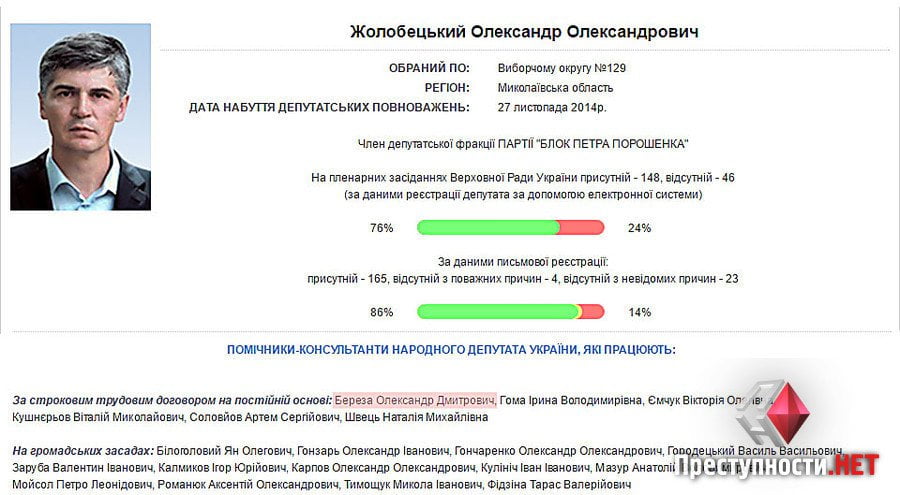 Однако сейчас информация на сайте ВР изменилась — Александр Береза больше не значится помощником нардепа Жолобецкого.