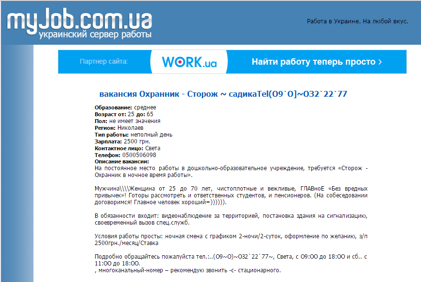 «Здравствуйте, на днях мой отец стал жертвой мошенников, он пенсионер и искал работу сторожа, нашел сайт, где предлагалась такая вакансия, и там был телефон с примечанием что звонить лучше с домашнего телефона, ну он и позвонил, как оказалось на 1200 грн, скрин сайта прикрепляю к этому письму и сохраненную веб-страницу», — сказано в письме читателя.