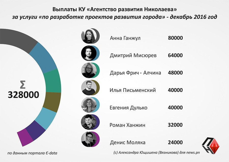 «Вместе с тем, во второй половине декабря, судя по информации портала использования публичных, то есть наших с Вами денег, следует, что ряд людей получили суммарно 328 тысяч гривен за «разработку проектов развития города». Каждый из проектов, а их, якобы, было 41, был оценен в 8 тысяч гривен. При этом все деньги получили семь так называемых «проектных менеджеров», заработав таким образом за декабрь месяц по несколько десятков тысяч гривен», — пишет Ющишена.