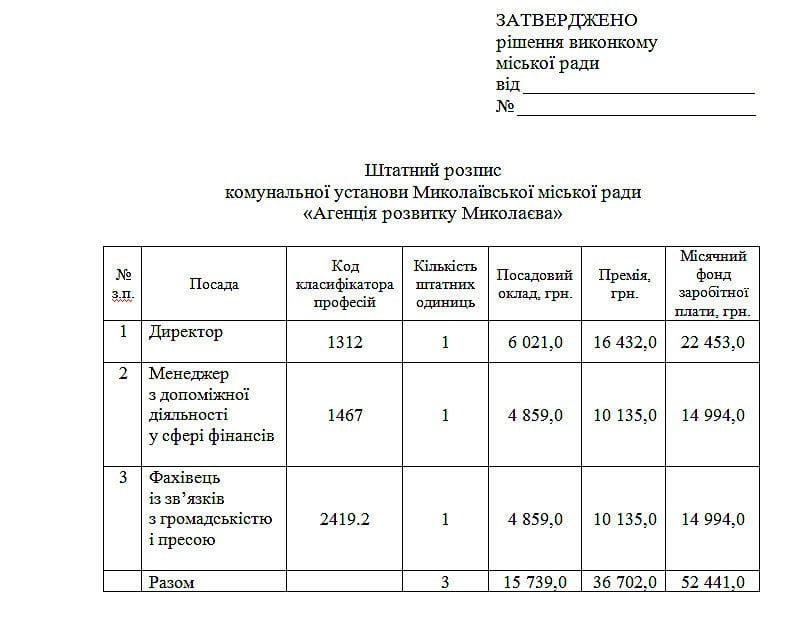 «В среднем это 16,5 тысяч гривен в месяц. Как известно, «Агентству развития Николаева» хотят поднять зарплаты в этом году и, согласно штатному расписанию, директор КУ сможет получать около 22,5 тысяч гривен», — пишет автор.