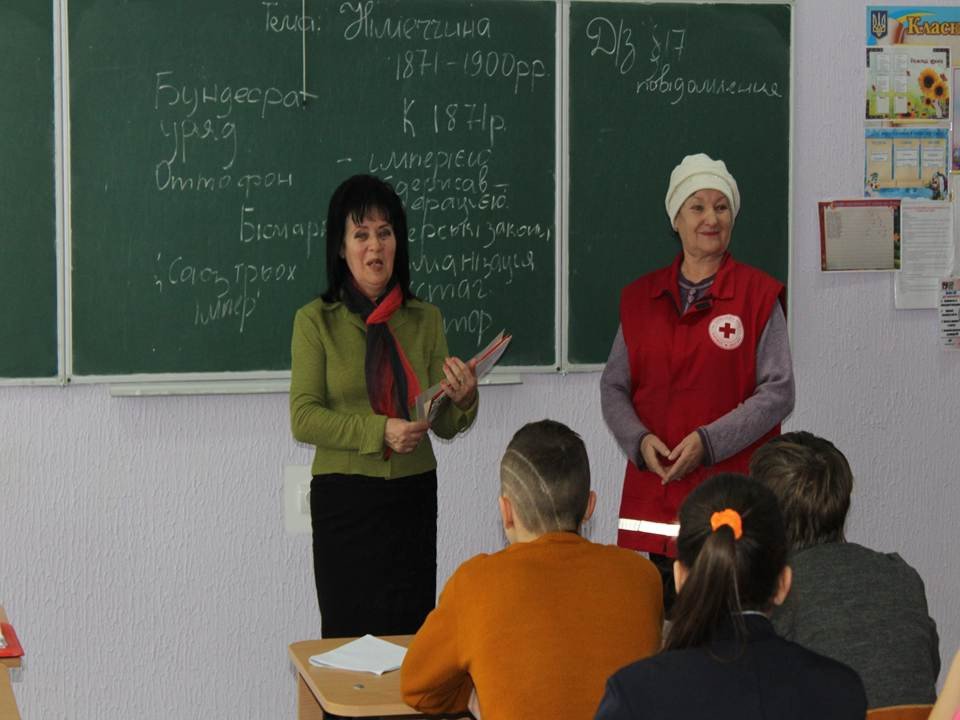 Тетяна Володимирівна розповіла дітям про історію організації, її діяльність, благодійні і миротворчі акції і місії в Миколаєві, Україні і світі. Валентина Олександрівна наголосила на важливості вміння надавати першу долікарську допомогу, адже бувають випадки, коли саме вчасна допомога рятує життя. Волонтери обговорили з учнями і одну з «найгостріших» проблем сучасності — СНІД, повідомили про шляхи запобігання хворобі і важливість толерантного ставлення до хворих людей.