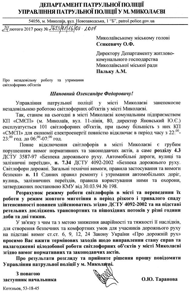 Працівники Управління патрульної поліції у місті Миколаєві звернулись до міської влади з приводу незадовільної роботи світлофорних об’єктів та наголосили на необхідності їх цілодобової роботи та переведення в режим миготіння жовтого сигналу після спаду інтенсивності.