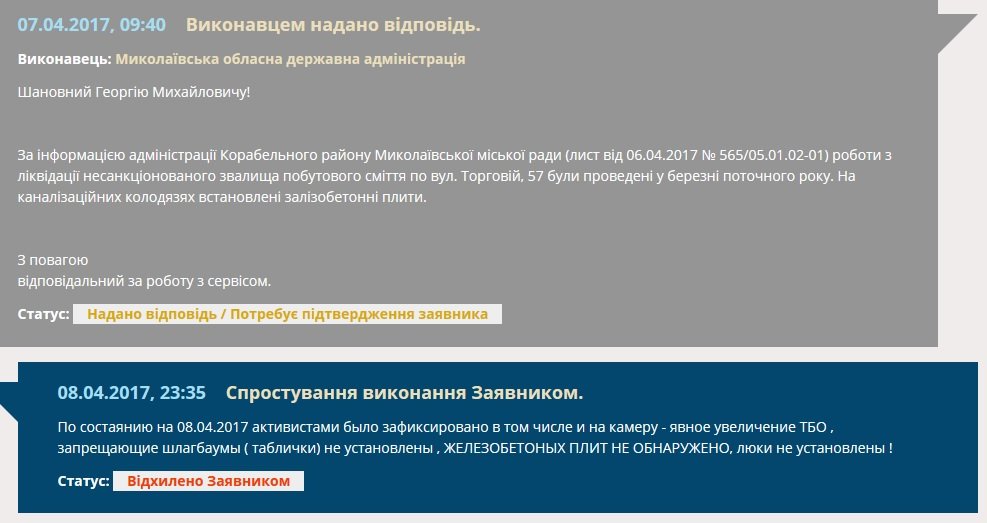 «По состоянию на 08.04.2017 активистами было зафиксировано в том числе и на камеру — явное увеличение ТБО, запрещающие шлагбаумы (таблички) не установлены, ЖЕЛЕЗОБЕТОНЫХ ПЛИТ НЕ ОБНАРУЖЕНО, люки не установлены!» — возмущен ответом чиновников Молчанов.