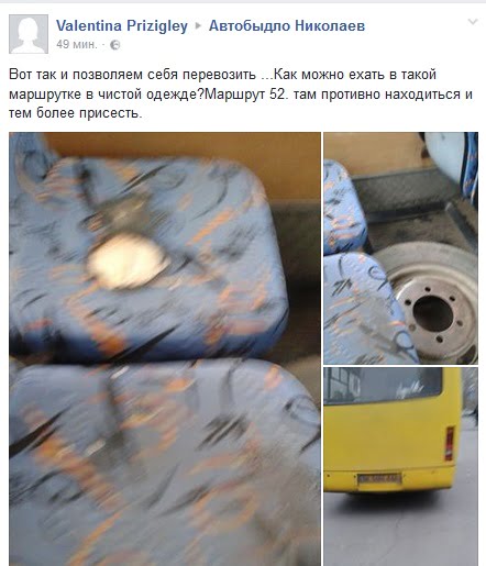 «Вот так и позволяем себя перевозить …Как можно ехать в такой маршрутке в чистой одежде? Маршрут 52. Там противно находиться и тем более присесть», — подписала Валентина опубликованные фотографии.