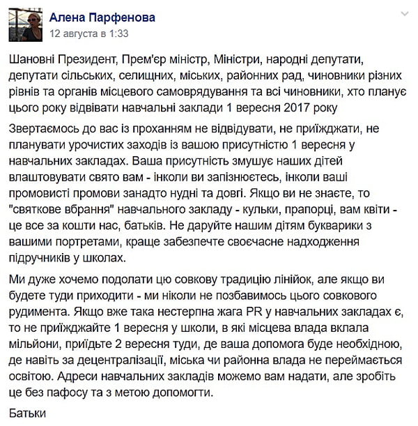 «Если уж у вас есть такая невыносимая жажда пиариться в учебных заведениях, то не приезжайте 1 сентября в школы, в которые местная власть вложила миллионы. Приезжайте 2 сентября туда, где ваша помощь будет необходимой, где даже при децентрализации городская или районная власть не заботятся об образовании», – заключается в обращении.