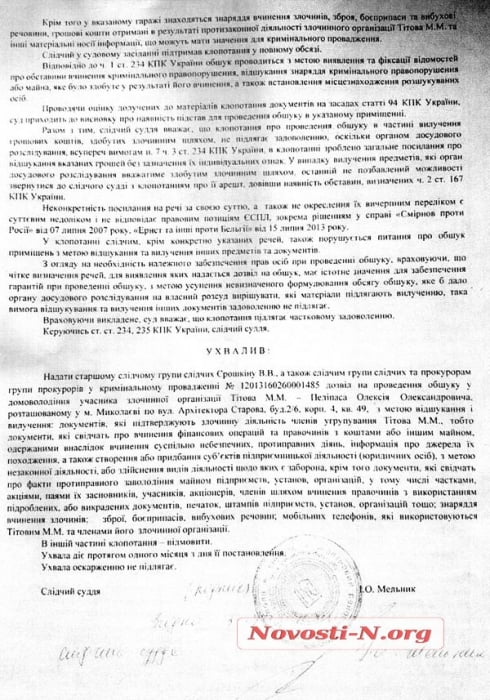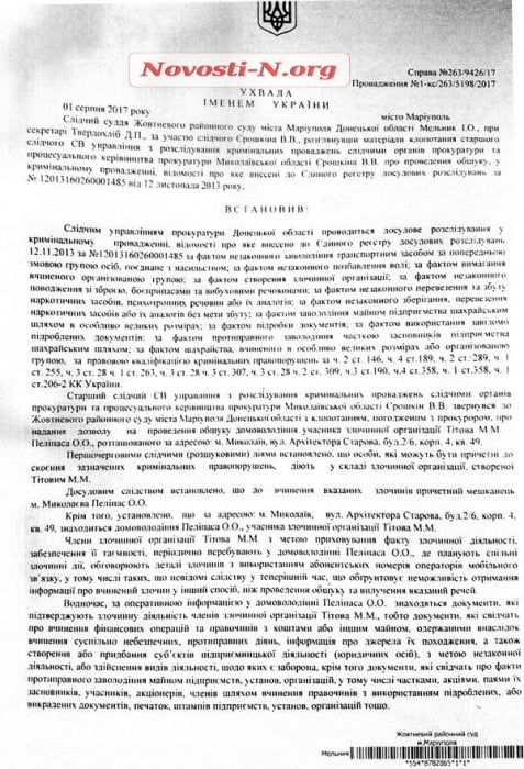 Итак, уголовное производство № 12013160260001485 открыто прокуратурой Николаевской области по признакам статей 146, 189, 190, 255, 289, 263, 307, 309, 358-й и ряда других. Ведет дело следователь Ерошкин. Разрешение на производство обысков выдано Жовтневым районным судом г. Мариуполя.