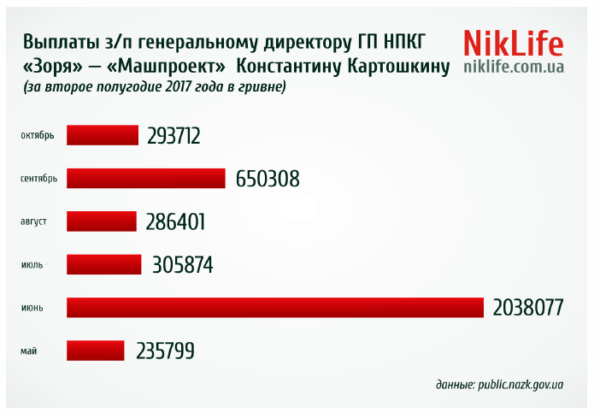 Генеральный директор ГП «Зоря»-«Маршпроект», депутат Николаевского городского совета от фракции «БПП» Константин Картошкин в июне 2017 года получил премию почти в два миллиона гривен, — сообщает «NikLife».