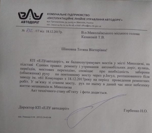 В связи с состоянием Ингульского пешеходного моста, КП «ЭЛУ автодорог Николаев» инициирует «ограничение на использование моста» до окончания проведения ремонтных работ.