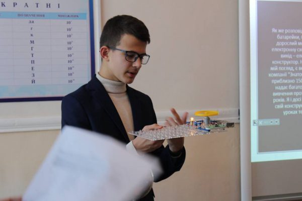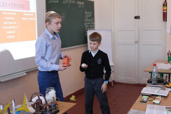 Наймолодшим учасником на уроці був третьокласник Висоцький Захар (учителька Ирина Кухаренко) , який працював у парі з Серьогіним Анатолієм над конструкцією власної моделі джерела струму.