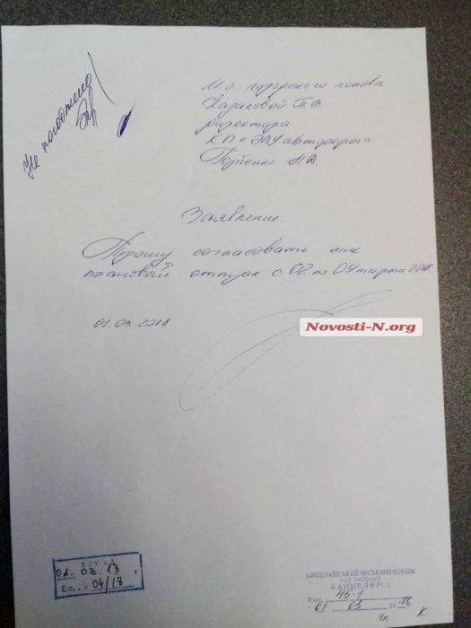 Согласно документу, Наталья Горбенко просила исполняющую обязанности Николаевского городского головы Татьяну Казакову согласовать плановый отпуск в период со 2 по 9 марта.