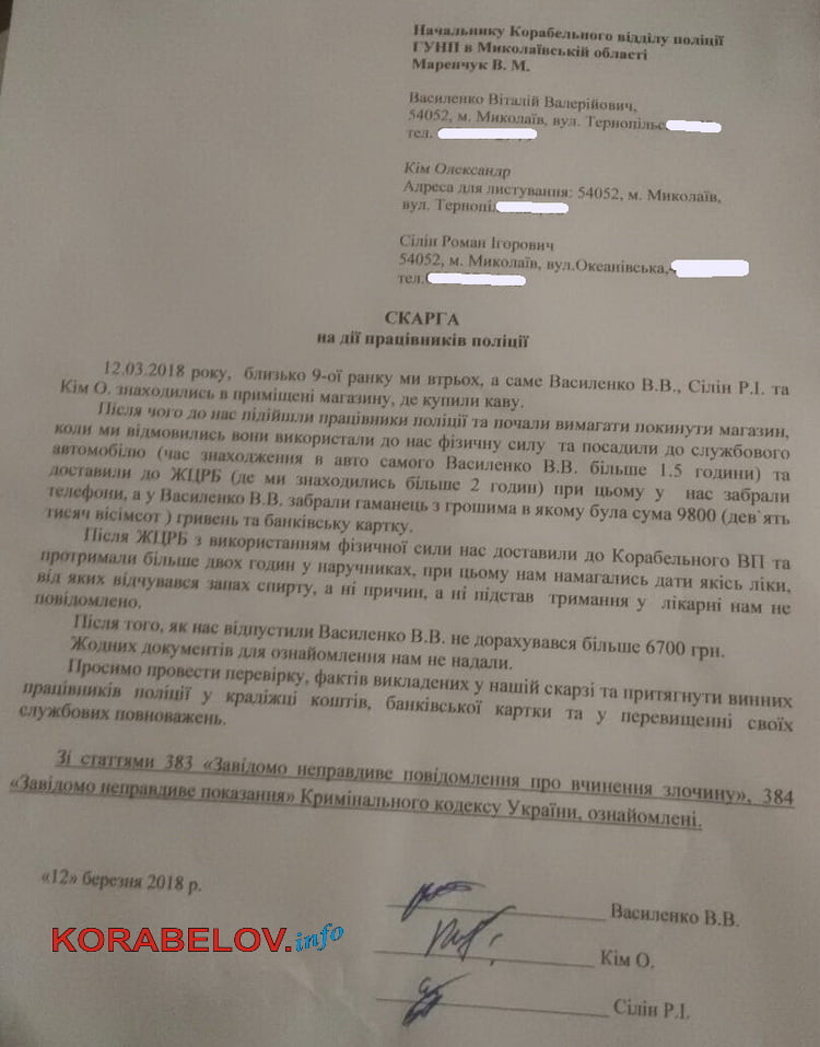 Жители Корабельного района города Николаева Виталий Василенко, Александр Ким, Роман Силин в понедельник, 12 марта, подали на имя начальника Корабельного отдела полиции жалобу относительно «превышения служебных полномочий» сотрудников патрульной полиции, обвиняя их также в неправомерном применении силы и даже в краже.