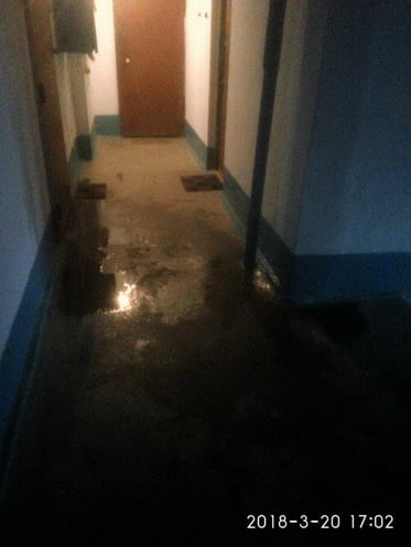 Лужа на лестничной площадке 9-го этажа и бегущая по стенам вода при входе в квартиру