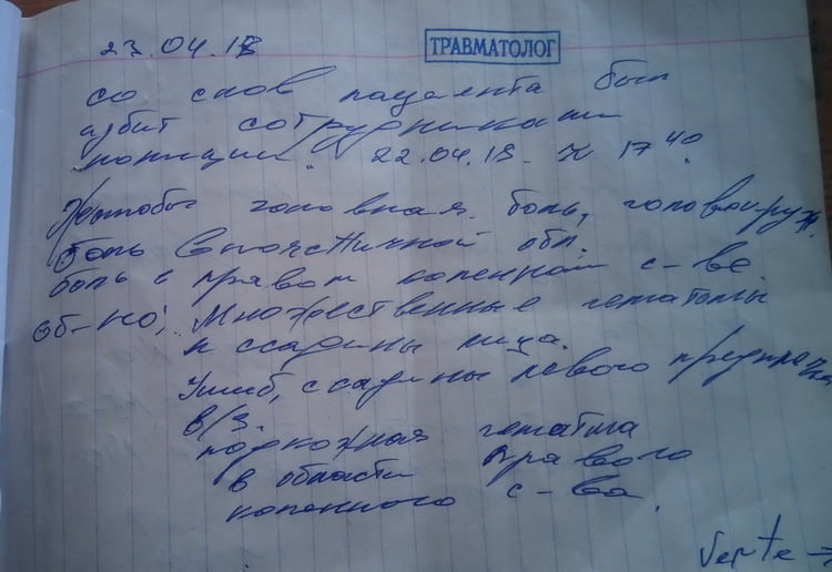 Через 15 минут приехал наряд полиции, сказали, что со службы мониторинга. Я сел к ним в машину и всё рассказал, как видел. В документе я видел, что пишут «Пояснення», но в пояснении они написали всего 3 строчки: какой номер машины, рост и цвет волос, и всё! Номер патрульной машины, которые меня избивали, — «3315«, их было двое ростом 175 см. Избили они меня примерно в 17:40.