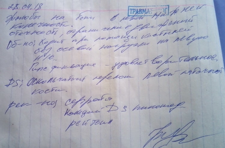 «24 апреля, в результате нарушения вестибулярного аппарата, я, перелезая через забор, прыгнул, и на пятку пришёлся кинетический удар — я получил оскольчатый перелом левой ноги», — добавил к рассказу Анатолий Сухих.