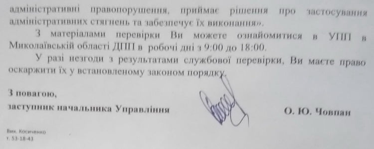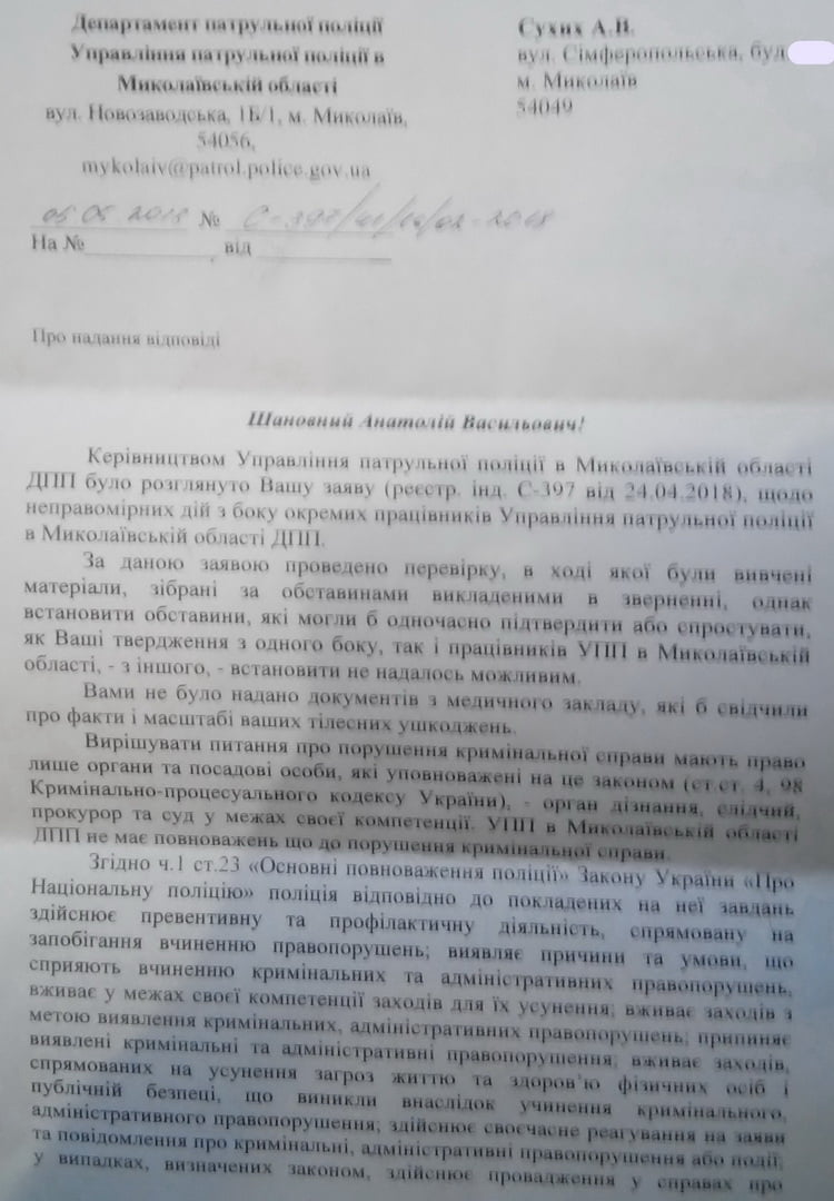 8 мая Анатолий получил письмо из Управления патрульной полиции: в ответе от 5 мая 2018 года на заявление Сухих в Департамент патрульной полиции (относительно неправомерных действий со стороны отдельных работников патрульной полиции) заместитель начальника Управления патрульной полиции в Николаевской области Човпан отметил, что по данному заявлению была проведена проверка, однако установить обстоятельства, которые могли бы подтвердить или опровергнуть как утверждения пострадавшего с одной стороны, так и работников УПП – с другой, — «не представилось возможным».