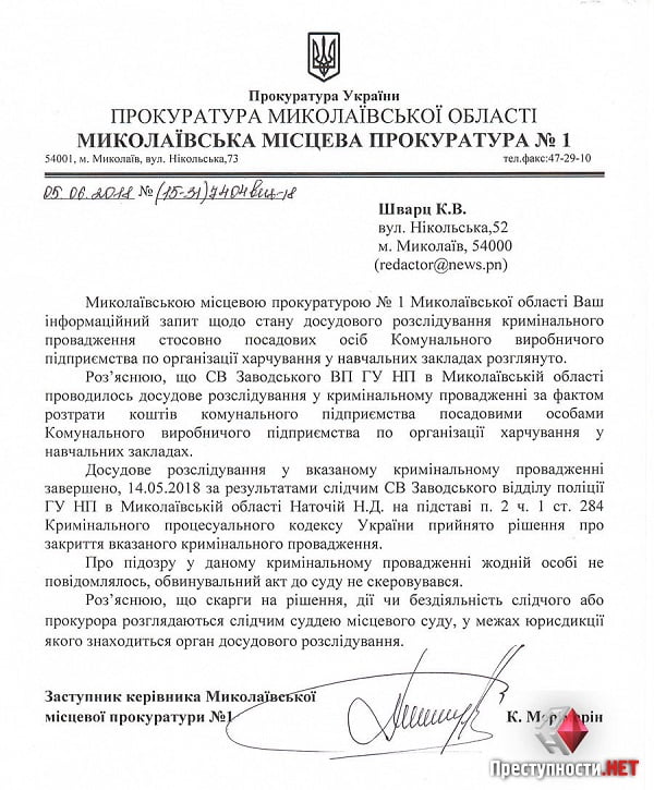 Об этом сообщили в Николаевской местной прокуратуре №1 в ответе на запрос корреспондента «Преступности.НЕТ».