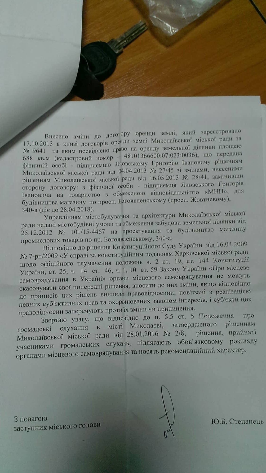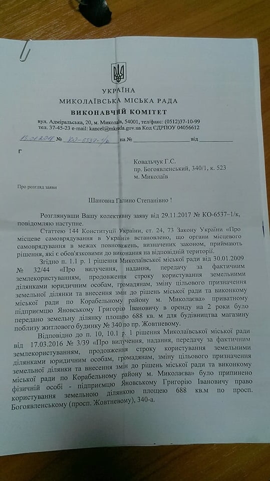 Напомним: два года назад жильцы данного общежития провели локальные общественные слушания, на которых в очередной раз сказали твердое “НЕТ” застройке перед своим домом. Но людей не услышали, проведя лишь «рокировку» претендентов на застройку: 31 августа 2016 г. мэр Николаева Александр Сенкевич подписывает “Договір про зміни”, по которому все права и обязанности, ранее принадлежавшие Г. И. Яновскому как арендатору городской земли, переходят к ООО “МНП”.