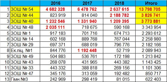 По таблице мы видим, что в лидерах рейтинга самых финансируемых находится школа №54 — 13,8 млн грн за последние три года, на втором месте — школа №44 — 3,8 млн грн, на третьем месте — школа №40 — 3,8 млн грн.