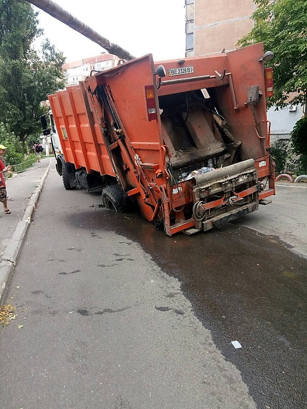 В Николаеве в понедельник, 6 августа, под мусоровозом провалилось дорожное покрытие.