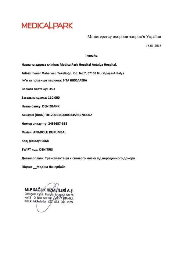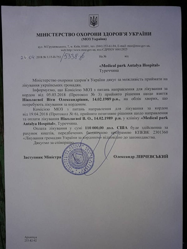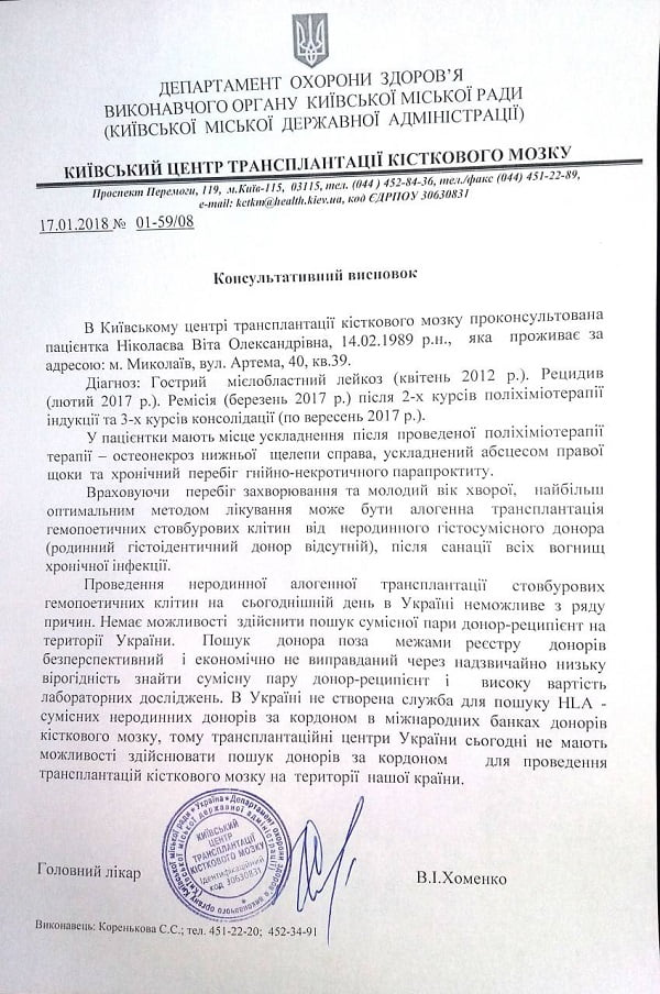 Напомним: МОЗ дал гарантийное письмо на оплату пересадки костного мозга Вите Николаевой в турецкой клинике. Однако одно из условий медвизы – минимум 10 тысяч долларов на счету. Да и оплата перелета, проживания, питания и самое важное – покупка иммуносупрессии ложится на плечи больных и их семей. На все дополнительные расходы семье Виты Николаевой необходимо было собрать как минимум 15 000 долларов. На сегодняшний день недостает 8 000 долларов.