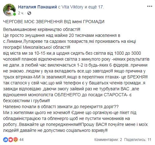 «Многоуважаемое руководство области! Это просто издевательство над почти 20 тысячами населения в с. Лиманы, Лупарево и садовых обществ, которые проживают на конце географии Николаевской области! От города мы за 10 — 15 км, а ежедневно сидят без света от 1000 до 3000 человек. Плановые отключения света с прошлого года никаких результатов не дали. В любое время отключается 1 — 2 из любых 6 фидеров…