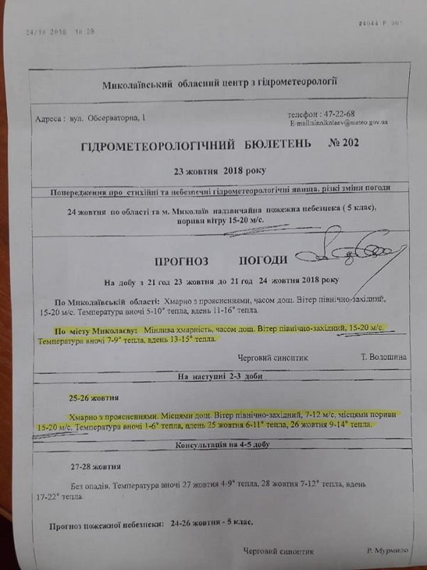 Стоит отметить, что к сообщению также прикреплен гидрометеорологический бюллетень, согласно которому 25-26 октября в Николаеве ожидаются переменная облачность, временами дождь, скорость ветра составит 7-12 м/c, а порывы временами составят 15-20 м/с. Температура воздуха ночью 25 октября составит 1-6 градусов тепла, а днем – 6-11 градусов. 26 октября температура воздуха составит 9-14 градусов тепла. Значительное потепление прогнозируется в воскресенье, 28 октября.