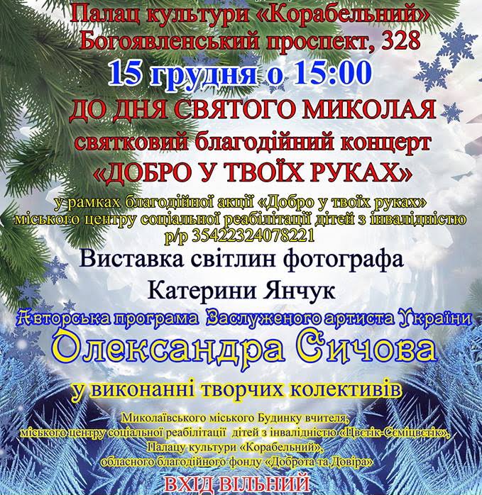 15 грудня о 15:00 до Дня святого Миколая в міському палаці культури «Корабельний» (за адресою м. Миколаїв, пр. Богоявленський, 328) відбудеться благодійний сольний концерт заслуженого артиста України Олександра Сичова.