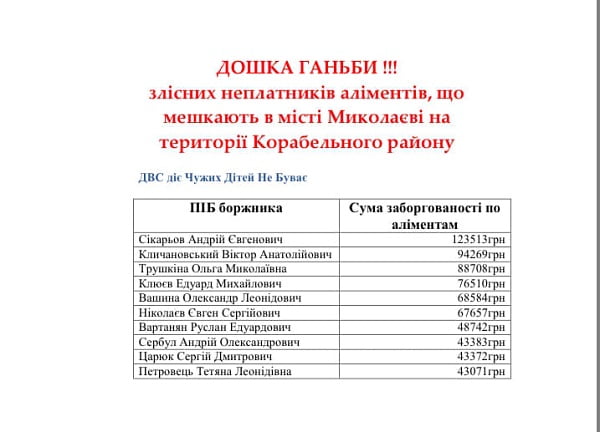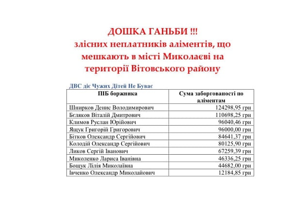 «С целью информирования граждан и обеспечения выполнения законодательства по усилению ответственности за неуплату алиментов управление государственной исполнительной службы Главного территориального управления юстиции в Николаевской области освещает обновленную информацию о злостных неплательщиков алиментов в Николаевской области», — сказано в сообщении.