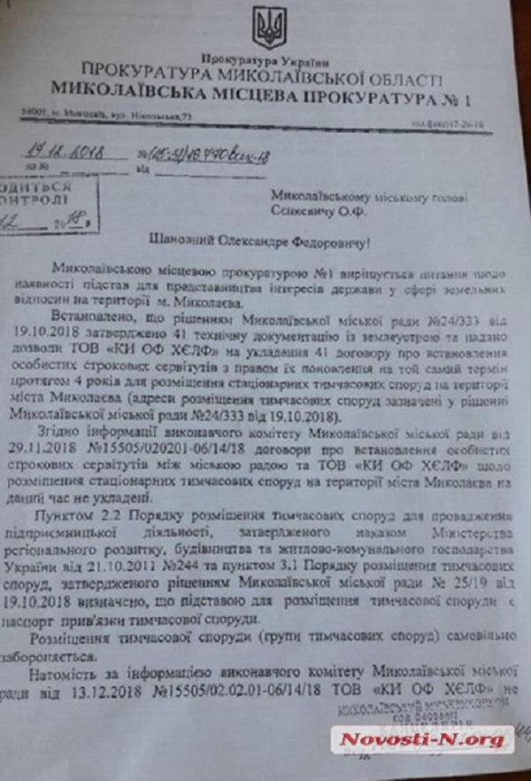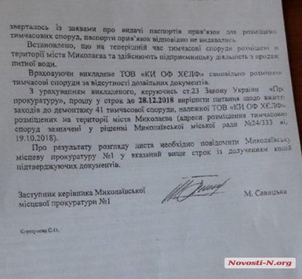 Согласно обращению прокуратуры, 19 октября решением Николаевского городского совета была утверждена техническая документация и дано разрешение компании «КИ ОФ ХЭЛФ» на установку временных сооружений на территории города Николаева. Речь идет о киосках, в которых продается питьевая вода «Живая вода».