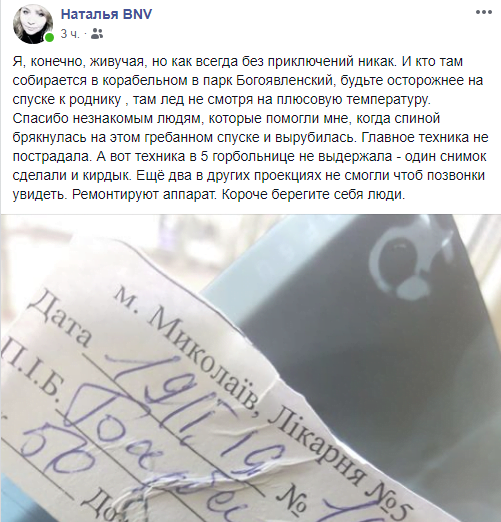 «Я, конечно, живучая, но как всегда без приключений никак. И кто там собирается в Корабельном в парк «Богоявленский», будьте осторожнее на спуске к роднику, там лед, несмотря на плюсовую температуру.