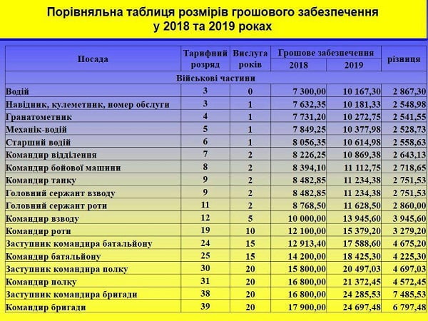 — военнослужащие рядового, сержантского и старшинского состава, которые проходят военную службу за контрактом (в 2018 году — от 7 000 грн., с 2019 года — от 10 000 грн.)