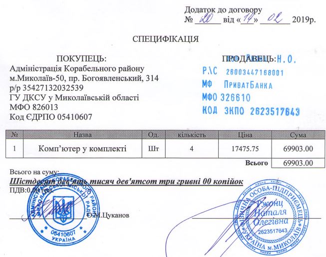 Так, в 2016 году администрация района в лице Александра Цуканова купила у данного поставщика 7 компьютеров на сумму 65 000 грн, а в в 2017 году — 6 компьютеров на сумму 69 966 грн.