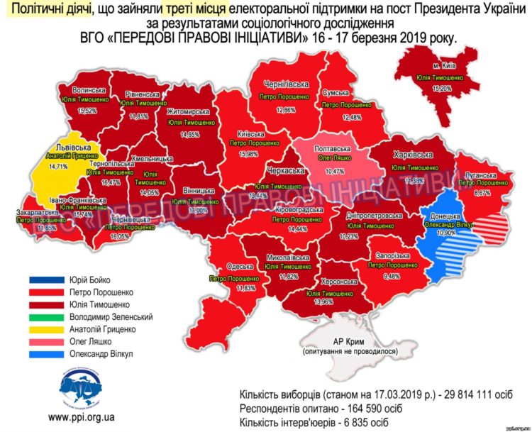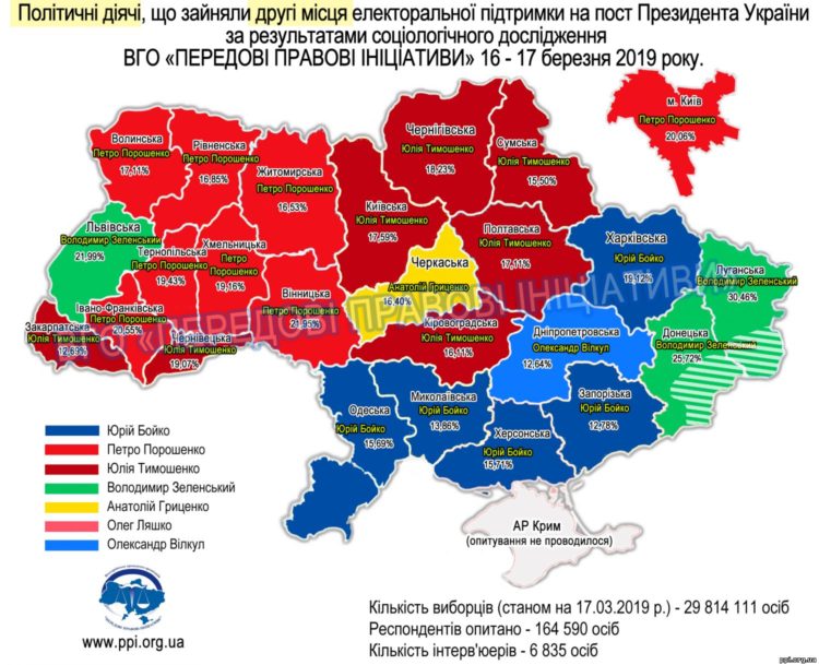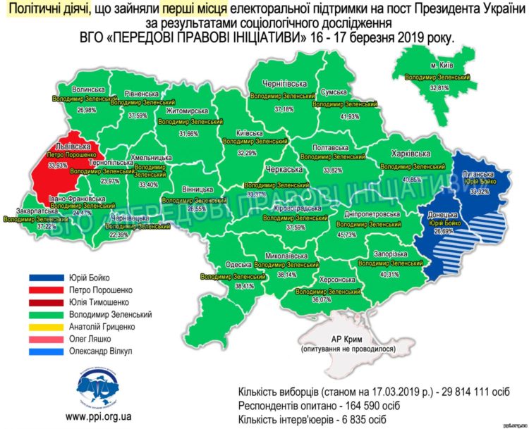 За результатами соціологічного дослідження, яке провела Всеукраїнська громадська організація «ПЕРЕДОВІ ПРАВОВІ ІНІЦІАТИВИ» 16 березня 2019 року, остаточно визначилася четвірка фаворитів серед кандидатів на пост президента України: електоральні симпатії виборців загалом по Україні віддають значну перевагу Володимиру Зеленському – 34,04%, за ним слідують Петро Порошенко – 14,22%, Юлія Тимошенко – 12,90%, та Юрій Бойко – 11,10%.