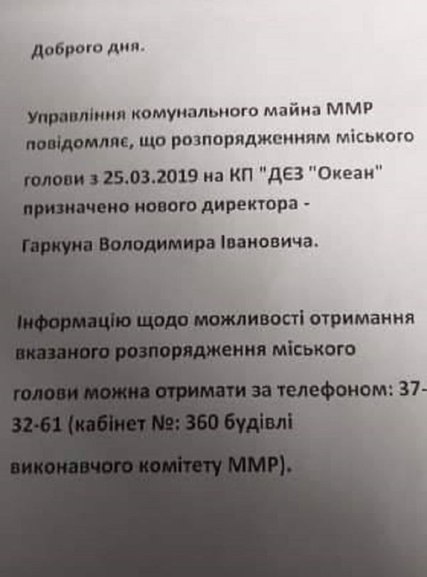 Николаевский городской голова Александр Сенкевич назначил директором ДЕЗ «Океан» назначили Гаркуна Владимира Ивановича с 25 марта.