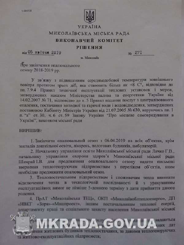 Как сообщается на официальном сайте Николаевского горсовета, решение принято в связи с повышением среднесуточной температуры воздуха.