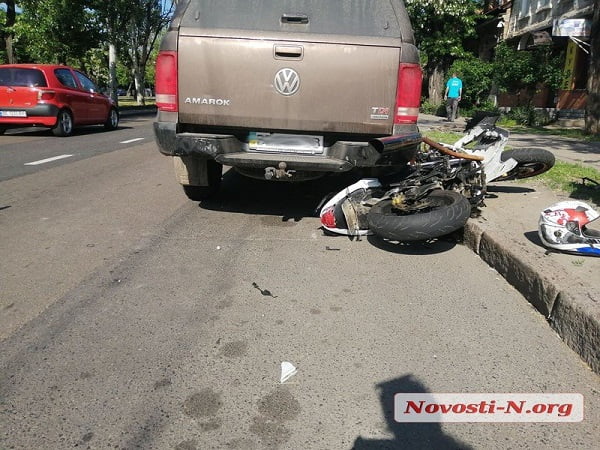 Утром в пятницу, 17 мая, на проспекте Центральном в Николаеве мотоцикл врезался в припаркованный автомобиль Volkswagen Amarok.