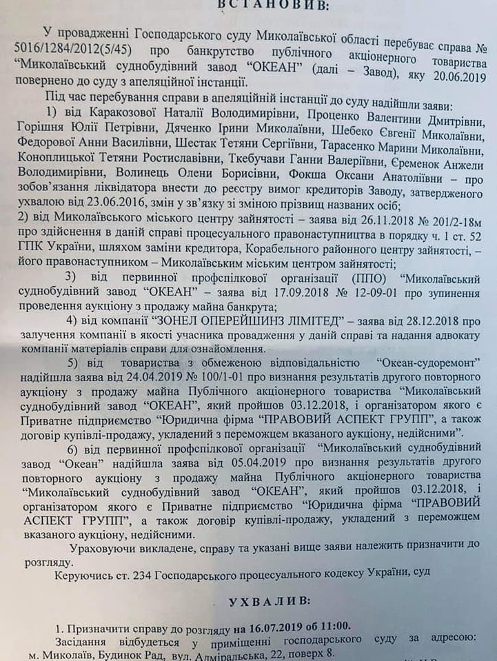 16 июля 2019 года Хозяйственный суд Николаевской области должен был вернуться к рассмотрению дела, длящегося еще с 2012 года, относительно ПАО «НСЗ «Океан», однако заседание не состоялось.
