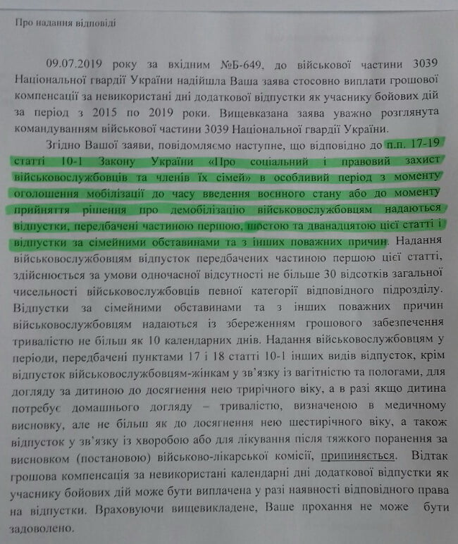 По его словам, дополнительные отпуска участникам боевых действий, служащим в их части, согласно указанному Закону, действительно не предоставляются (в особый период предоставление таких отпусков прекращено), и в 2019 году поступали заявления относительно компенсации за неиспользованные дни отдыха всего от двух военнослужащих. Им были отправлены ответы-отказы следующего (стандартного) содержания: