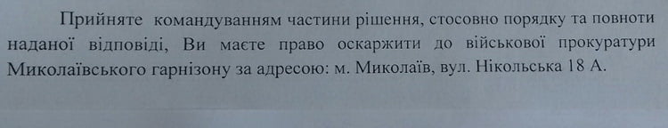 Редакция обратилась за комментариями относительно поступившей жалобы к командованию указанной части. Как пояснил заместитель командира по работе с личным составом Сергей Киричок, в части руководствуются именно Законом Украины «Про социальную и правовую защиту военнослужащих и членов их семей».