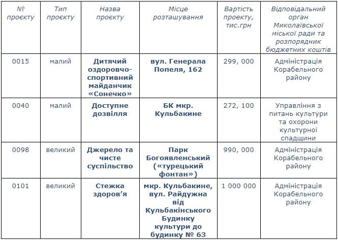 В Корабельному районі переможцями на 2020 рік стали проекти, по більшості з яких розпорядником бюджетних коштів буде Адміністрація Корабельного району.