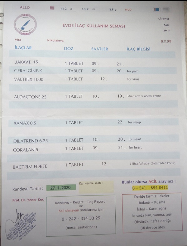 Напомним: в прошлом году МОЗ дал гарантийное письмо на оплату пересадки костного мозга (в борьбе с острым миелобластным лейкозом) Вите Николаевой в турецкой клинике, а деньги на дополнительные расходы, которые ложатся на плечи семьи пациента, собирали, что называется, «всем миром». Операция давно позади, однако недавно у Виты началась реакция «трансплант против хозяина», а на необходимое лекарство у семьи денег не хватает.