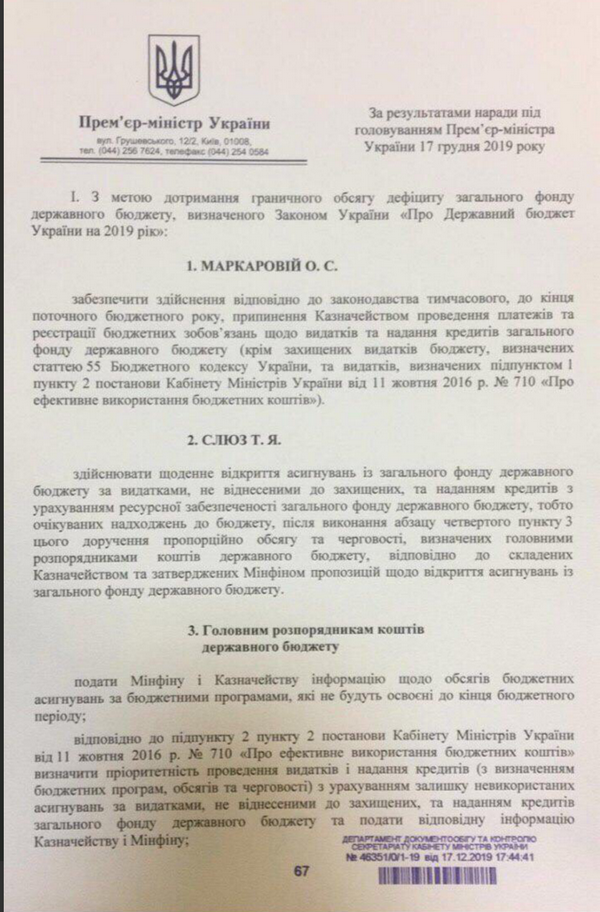 «Обеспечить временное, до конца года, прекращение проведения Казначейством платежей и регистрации бюджетных обязательств по расходам и предоставление кредитов общего фонда госбюджета (кроме защищенных расходов бюджета)», – говорится в документе.