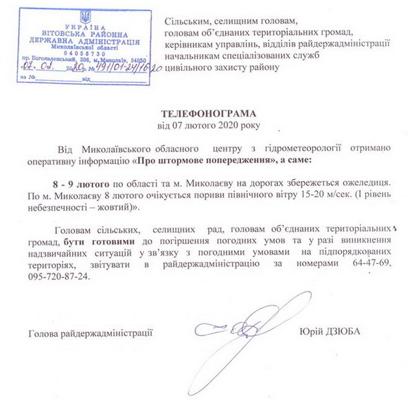 Про це йдеться в документі, що було опубліковано у другій половині дня 7 лютого на офіційній Фейсбук-сторінці Вітовської РДА. Так, у телефонограмі за підписом голови районної державної адміністрації Юрія Дзюби, який вимагає від своїх підлеглих бути готовими до погіршення погодних умов, сказано про отриману від гідрометеорологів інформацію:
