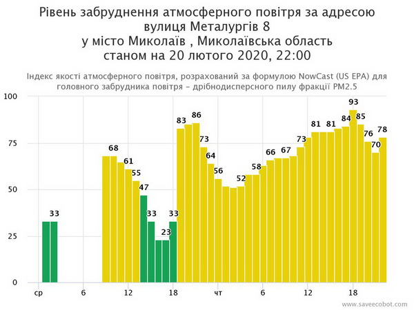 Судя по данным, зафиксированным датчиком измерительного пункта, установленного на улице Металлургов в городе Николаеве и определяющего уровень загрязнения атмосферного воздуха, вечером в четверг, 20 февраля, качество воздуха в Корабельном районе было близким к «нездоровому».