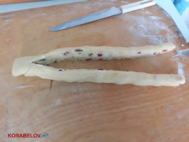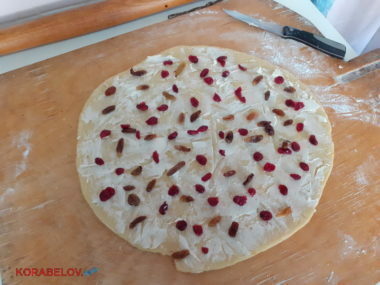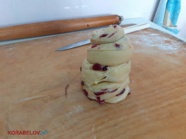 Подошедшее тесто выкладываем на стол и делим на 2-3 части, скатываем в шарики, накрываем пленкой и оставляем отдохнуть на 5-10 минут. Раскатываем по одному шарику теста в очень тонкий прямоугольный пласт, обильно смазываем его размягченным сливочным маслом. Сверху посыпаем мускатным орехом. Раскладываем по всему тесту вяленую клюкву (можно добавить разные сухофрукты). Аккуратно сворачиваем пласт теста в плотный рулет. Острым ножом разрезаем рулет вдоль, но не до конца, оставляем примерно 2 см.